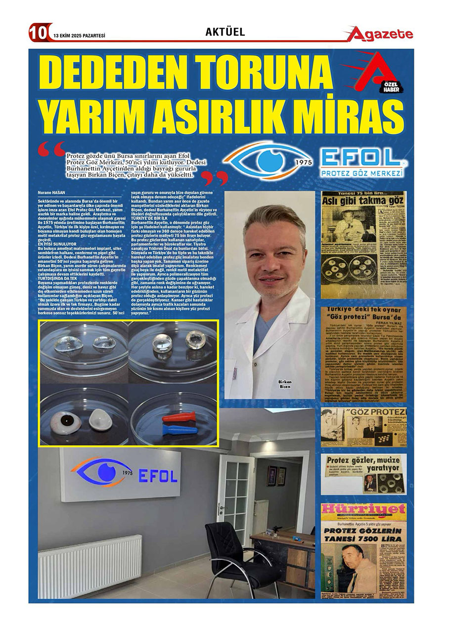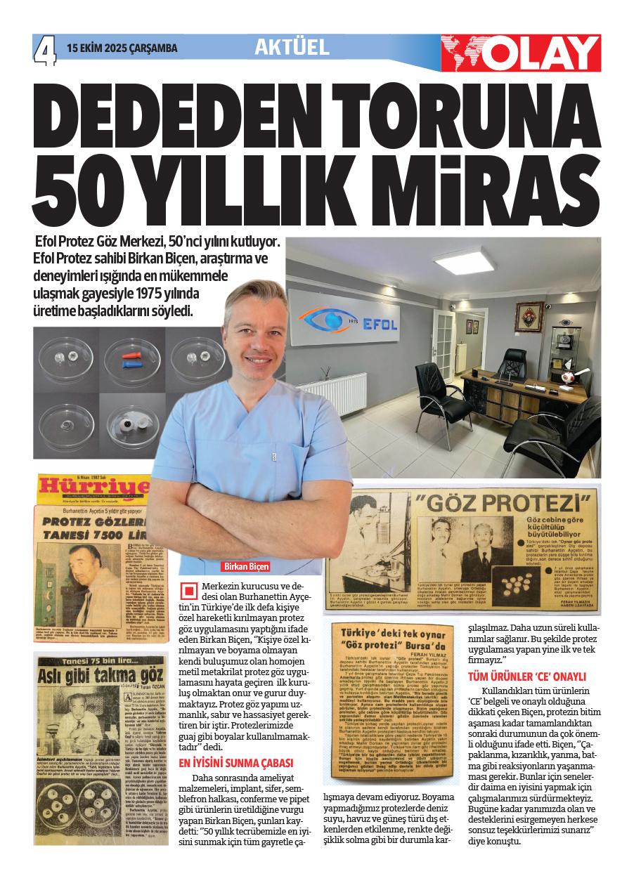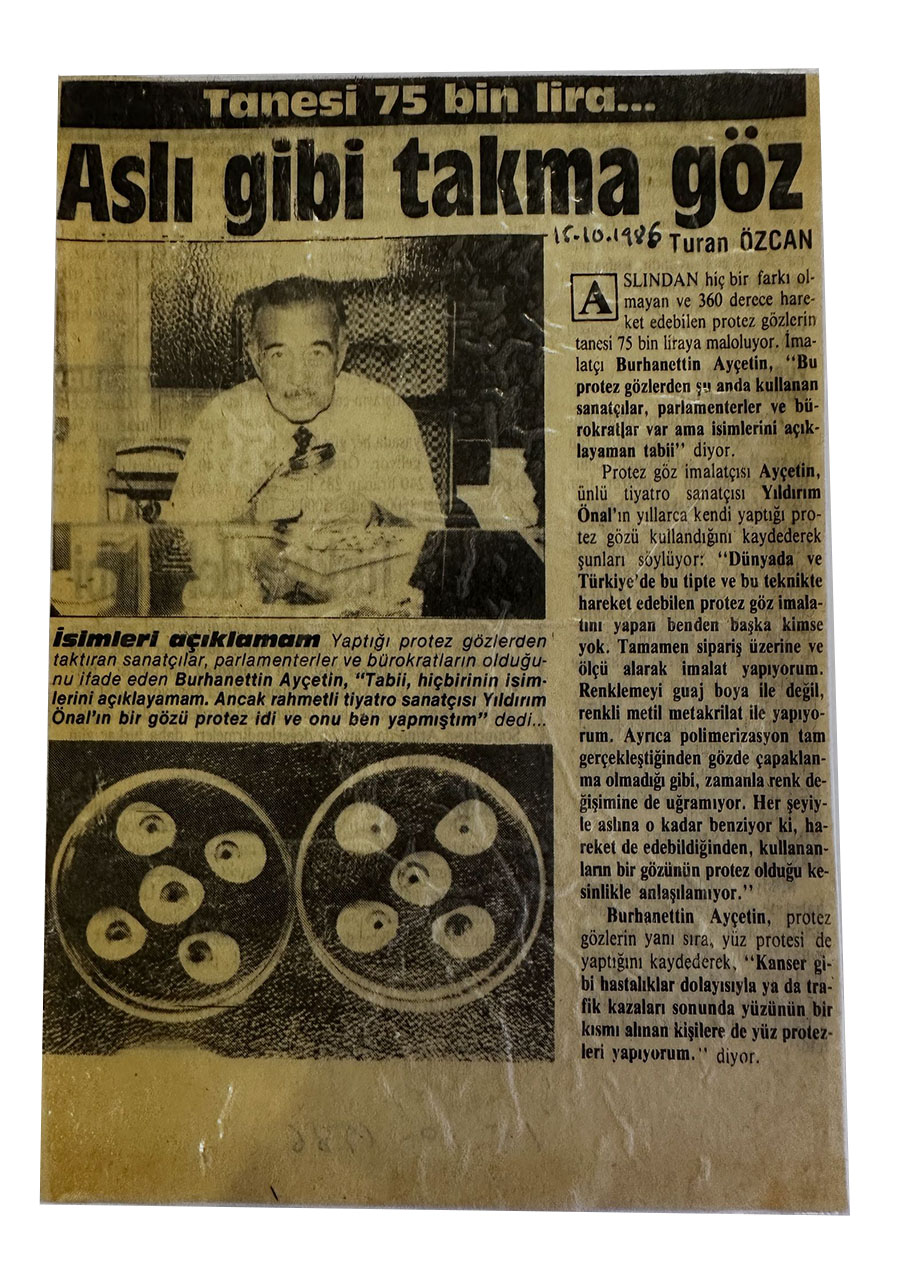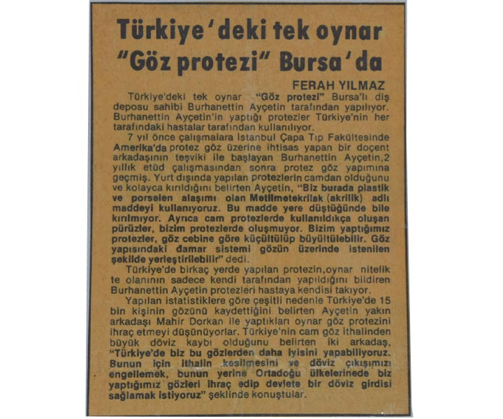 Plastic prosthetic eyes firstly used in America in 1941. After, applied in Europe and Turkey. First personal mobile prosthetic eye in Turkey applied by Burhanettin AYCETIN who founder of Efol Prosthetic eye. We are the first and only company without dying. We as Efol Prosthetic Eye Center, continue to work with the same meticulous and renewed products (prosthetic eye, epithesis prosthesis, implant, sphere, conforme, conberg ring and etc.) since 1975.